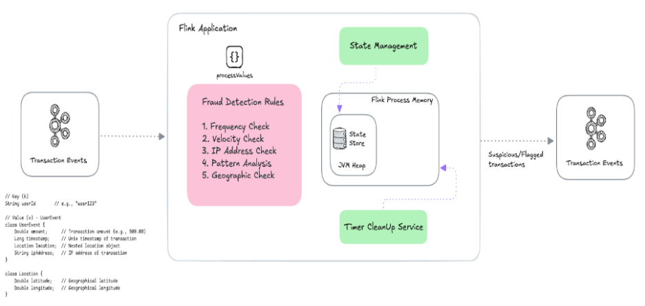 - State Management: Flink can track user sessions and behavior across events, which is crucial for identifying anomalies in financial fraud detection systems.